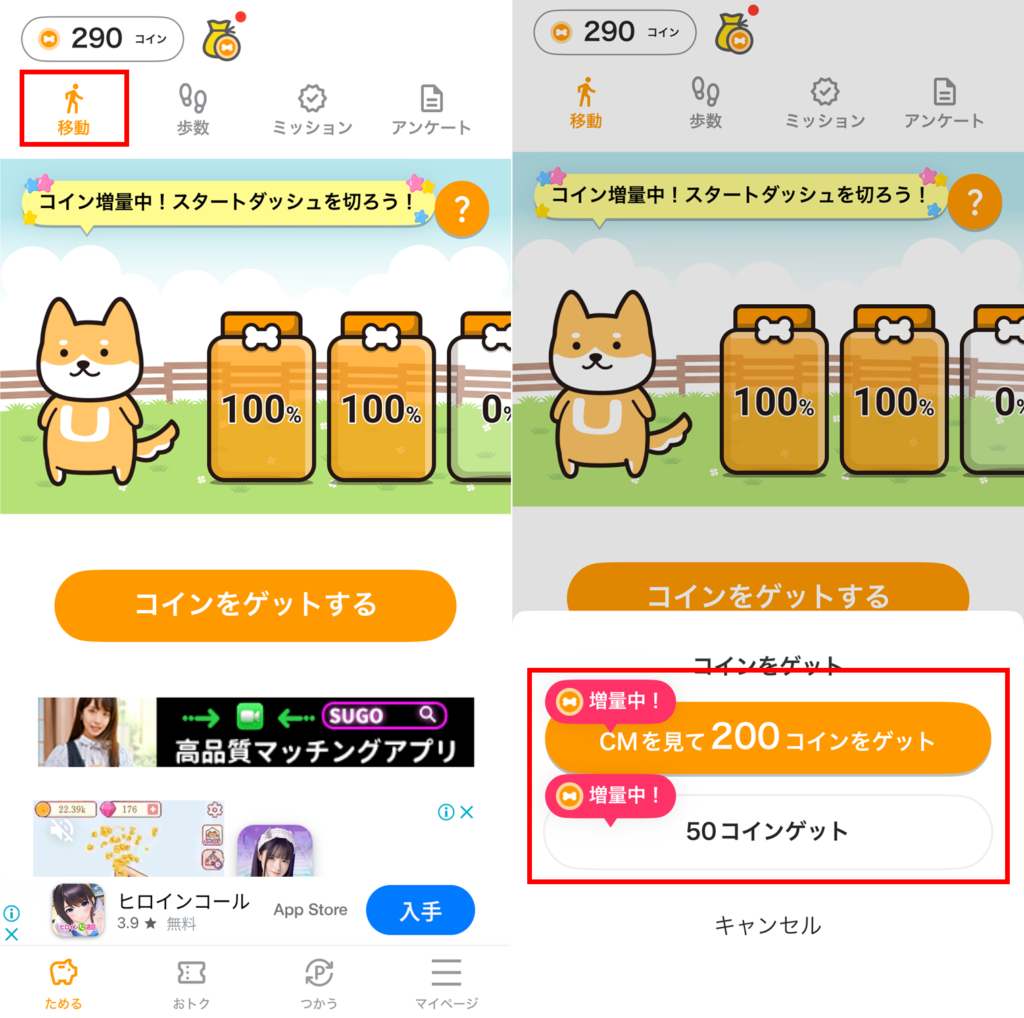⑧「移動距離」による「コインの取得方法」についての説明があるため、「次へ」をタップ。