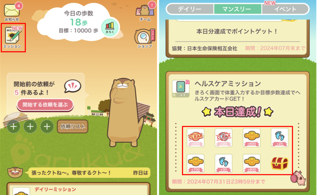 その後ホーム画面左端の「ミッション」⇒「マンスリー」⇒「ヘルスケアミッション」をタップするだけです。