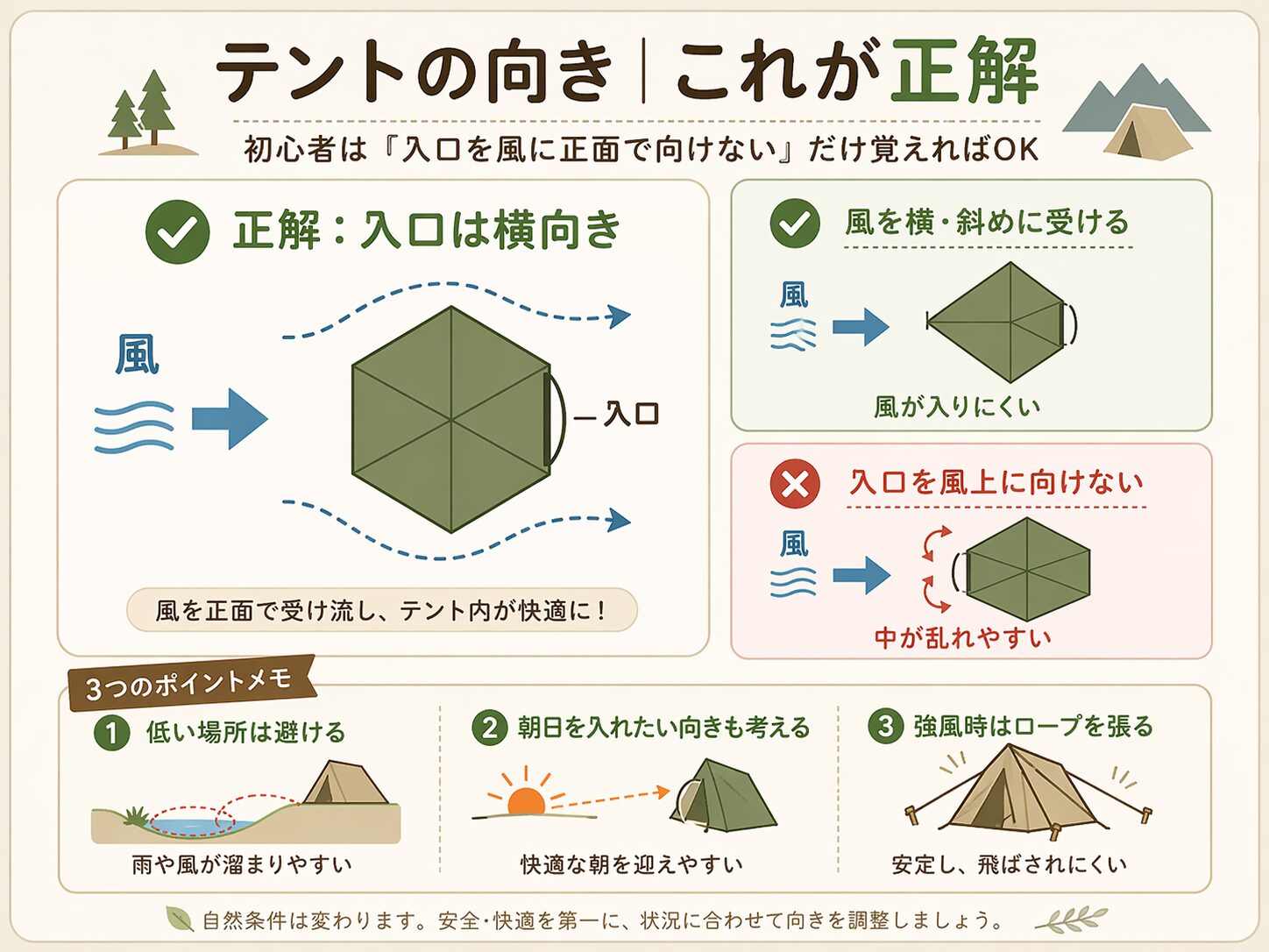 | 風向き | 木・旗・体感で確認 | 重要 | 入口を正面風に向けない |